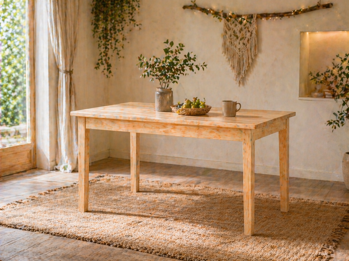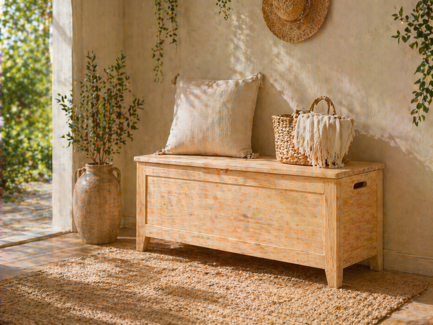 Sedia a dondolo in legno massello con cuscini in tessuto grigio e arancione