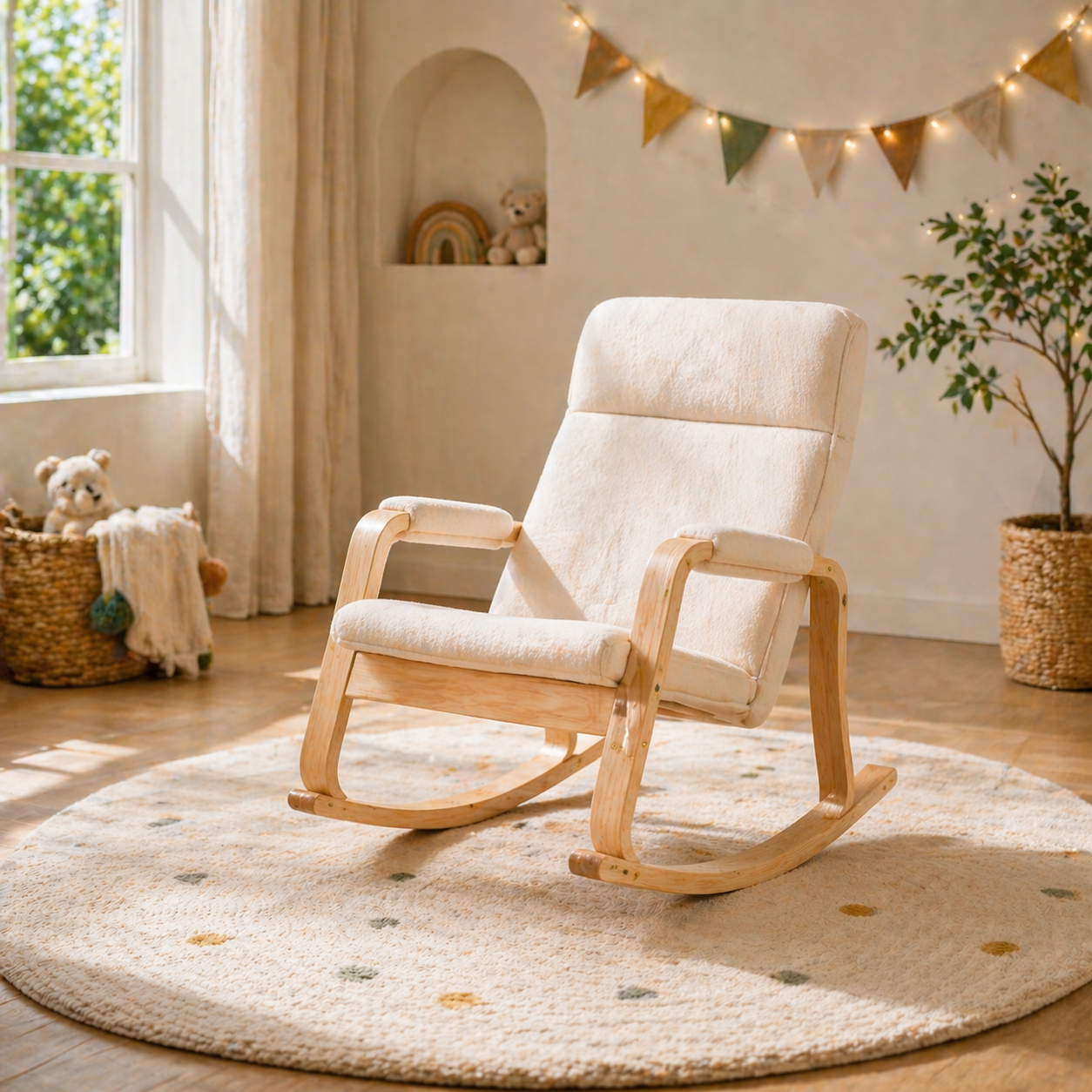 Sedia a dondolo in legno e tessuto verde con struttura rinforzata