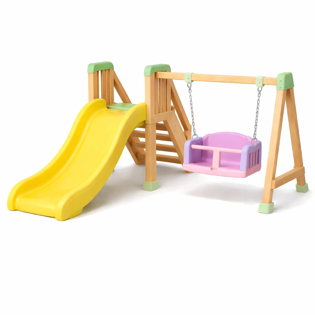 Scivolo e altalena per bambini con struttura in legno e elementi in plastica.